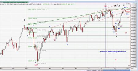 Derzeit befindet sich der Dow Jones in der Welle 4 der Welle 3 der Welle 5/alternativ1: Welle 4 der Welle 5//alternativ2 und nicht favorisiert: c einer überschiessenden Welle b. (D.h. Es folgen noch ein kurzer Rücksetzer in einer 4 und dann der finale Anstieg in diesem Wellenabschnitt.) Ob die Welle 4 bereits abgeschlossen ist, wird die erste Septemberwoche zeigen.