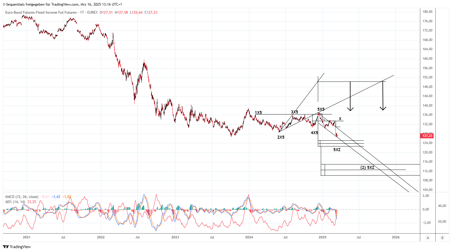 Des Weiteren ist nach Erreichen der Kurszielzone in Abwärtsrichtung ein Hochpunkt ungefähr in der letzten Mai 2025 Woche zu lokalisieren. Es muss dann evaluiert werden, ob ein Trend-Trade erfolgen kann oder nicht. Für ein Handelssignal ist es notwendig, dass der Bund Future in den Widerstandsbereich bei 128,34 Euro bis 129,96 Euro ansteigt. Es wird dann nach einem Short-Einstieg bis 123,85 Euro Ausschau gehalten.