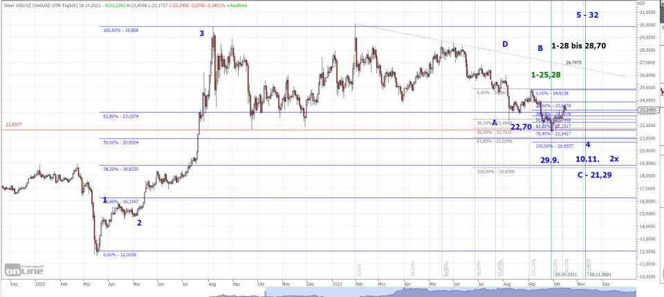 Es sei explizit erwähnt, dass ein alternatives Szenario nach einer Zwischenerholung bis in den Bereich 1253 USD/1330 ( → jeweils Rückkehr zu einer vorherigen Welle 4 auf unterschiedlichen Wellengraden) weitere Abverkäufe bis in den Bereich von ca. 800 USD vorsieht. Es gibt durchaus Gründe, die auch dieses Szenario noch weiter fallender Preise plausibel erscheinen lassen.